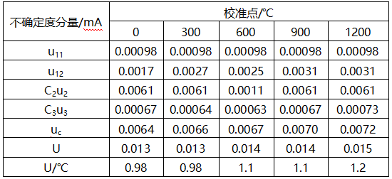 (5)對(duì)測(cè)量范圍0-1200℃的不帶傳感器的配K型熱電偶的溫度變送器的測(cè)量不確定度的評(píng)定見(jiàn)表4。