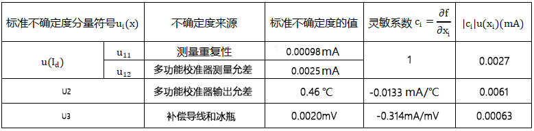 (1)由溫度變送器的輸出電流的測(cè)量重復(fù)性和多功能校準(zhǔn)儀的測(cè)量誤差引起的不確定度分量u(Id)