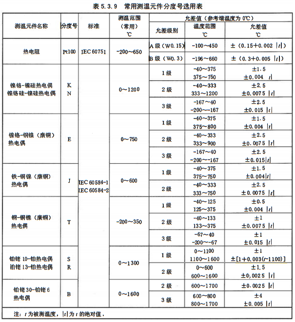 ⑦溫度測(cè)量范圍大、有振動(dòng)場(chǎng)合宜選用熱電偶。熱電偶可選用K、N、E、J、T、S、R、B分號(hào)且,應(yīng)符合IEC60584-1及IEC60584-2標(biāo)準(zhǔn),測(cè)溫范圍和允差值應(yīng)符合表5.3.9規(guī)定。