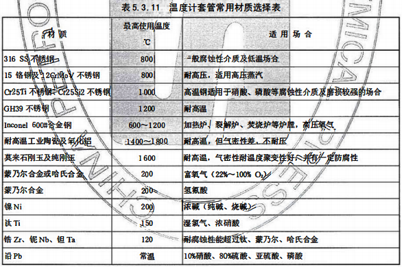 d)溫度計(jì)套管材質(zhì)的選用應(yīng)滿(mǎn)足溫度測(cè)量范圍及防腐蝕、防磨蝕等要求,最低應(yīng)選用316SS并且不應(yīng)低于設(shè)備或管道材質(zhì),設(shè)計(jì)可按表5.3.11選擇相應(yīng)的材質(zhì):