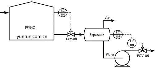 對于FWKO罐,液位為控制變量,出口流量閥LCV-101為操縱變量。對于分離器,由于泵的非線性動力學,采用串級液位(LC-102)輸出流量(FC-101)控制回路來改進液位控制。