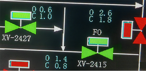 綠色代表閥門開,紅色代表閥門關(guān)。閥門示意圖中,上面方塊部分紅色代表關(guān)命令,綠色代表開命令,閥門下部紅色代表關(guān)回訊,綠色代表開回訊,閥門旁邊有開關(guān)時間計時。如XV-2415 C 0.8代表XV-2415緊急切斷閥關(guān)閉時間是0.8秒,打開時間是1.4秒。如發(fā)出命令后,3秒(時間可設(shè)定)閥位回訊未返回,則立刻報警。